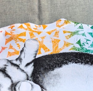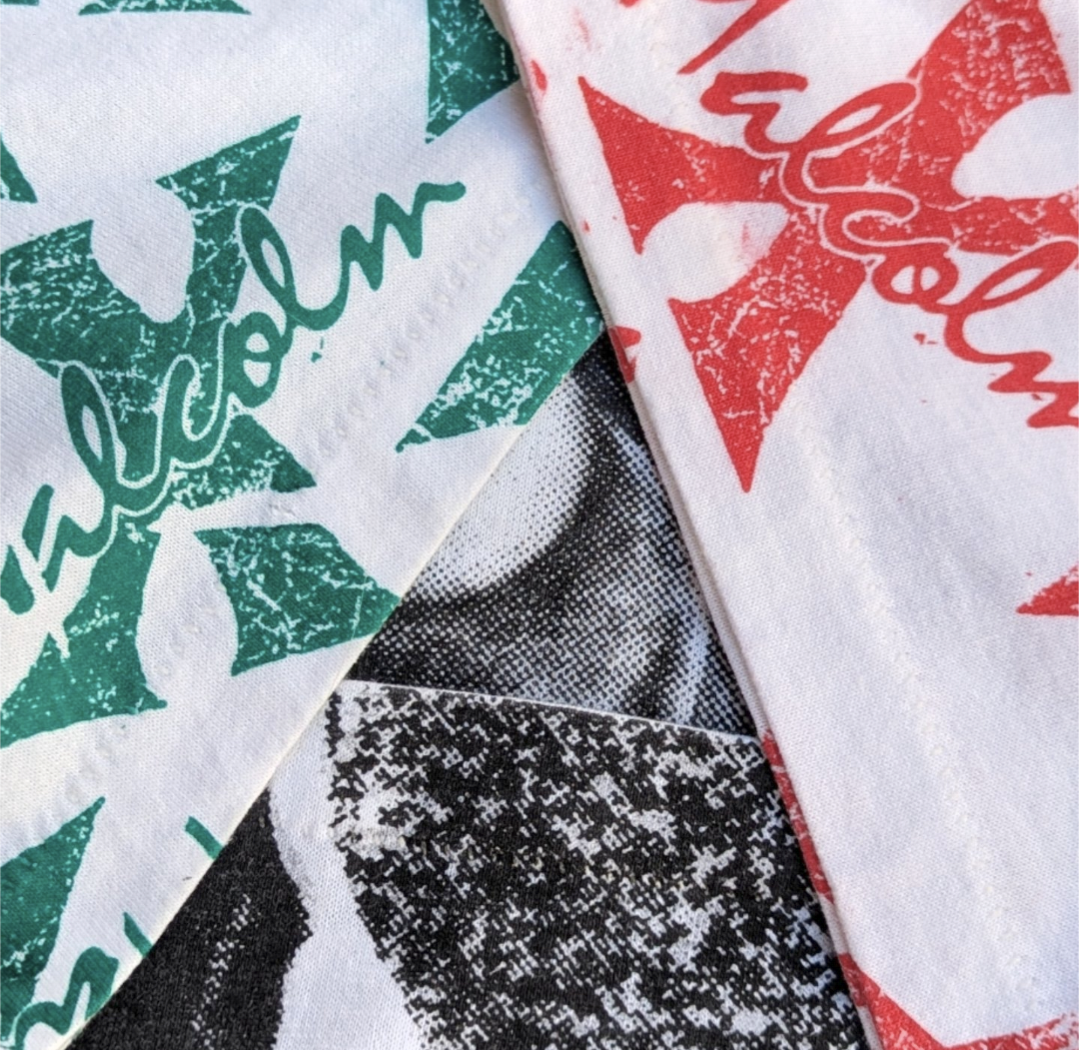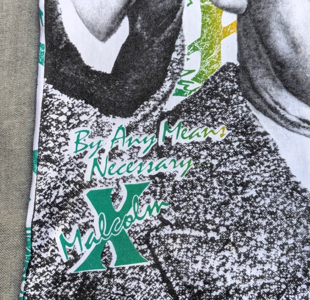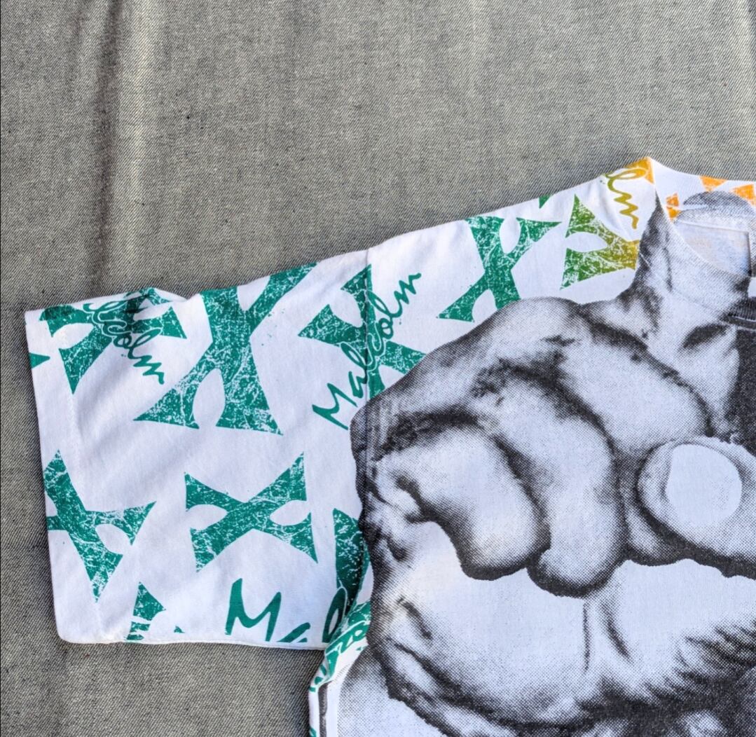 空いているスペースに、黄色、赤、緑で"Malcolm X"の文字をこれでもかと敷き詰めた1着。