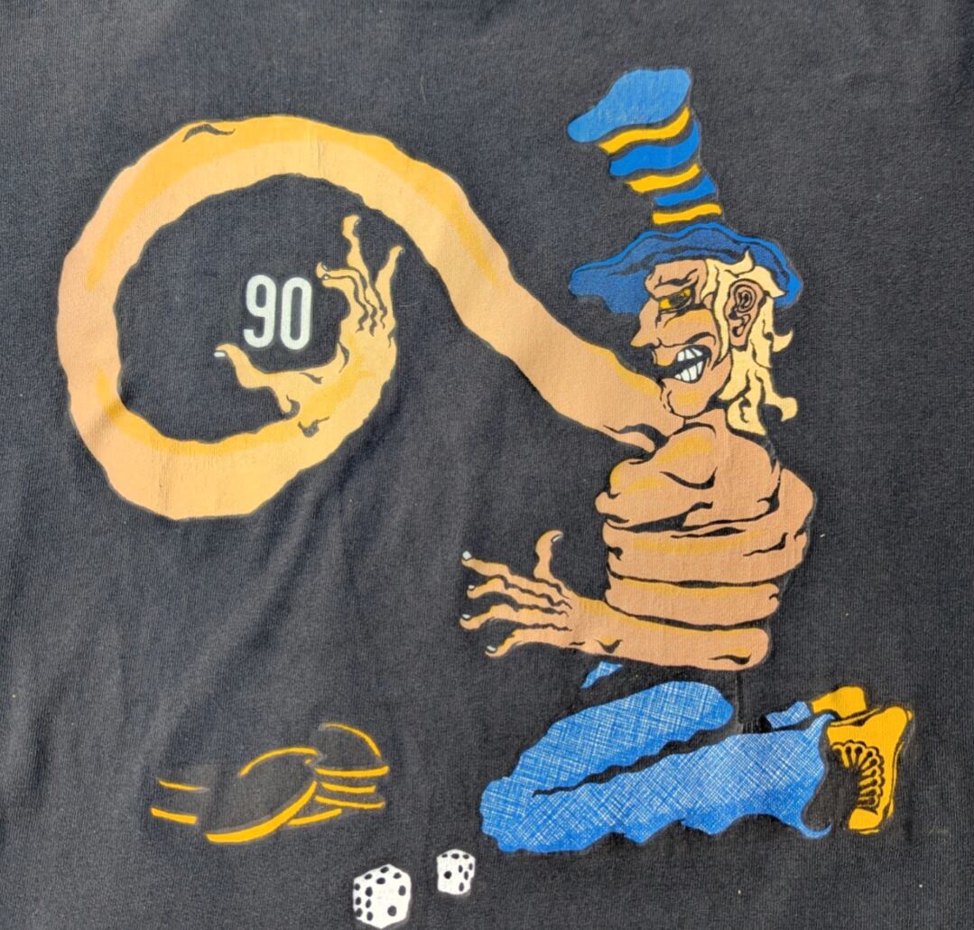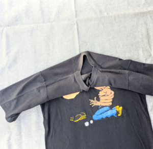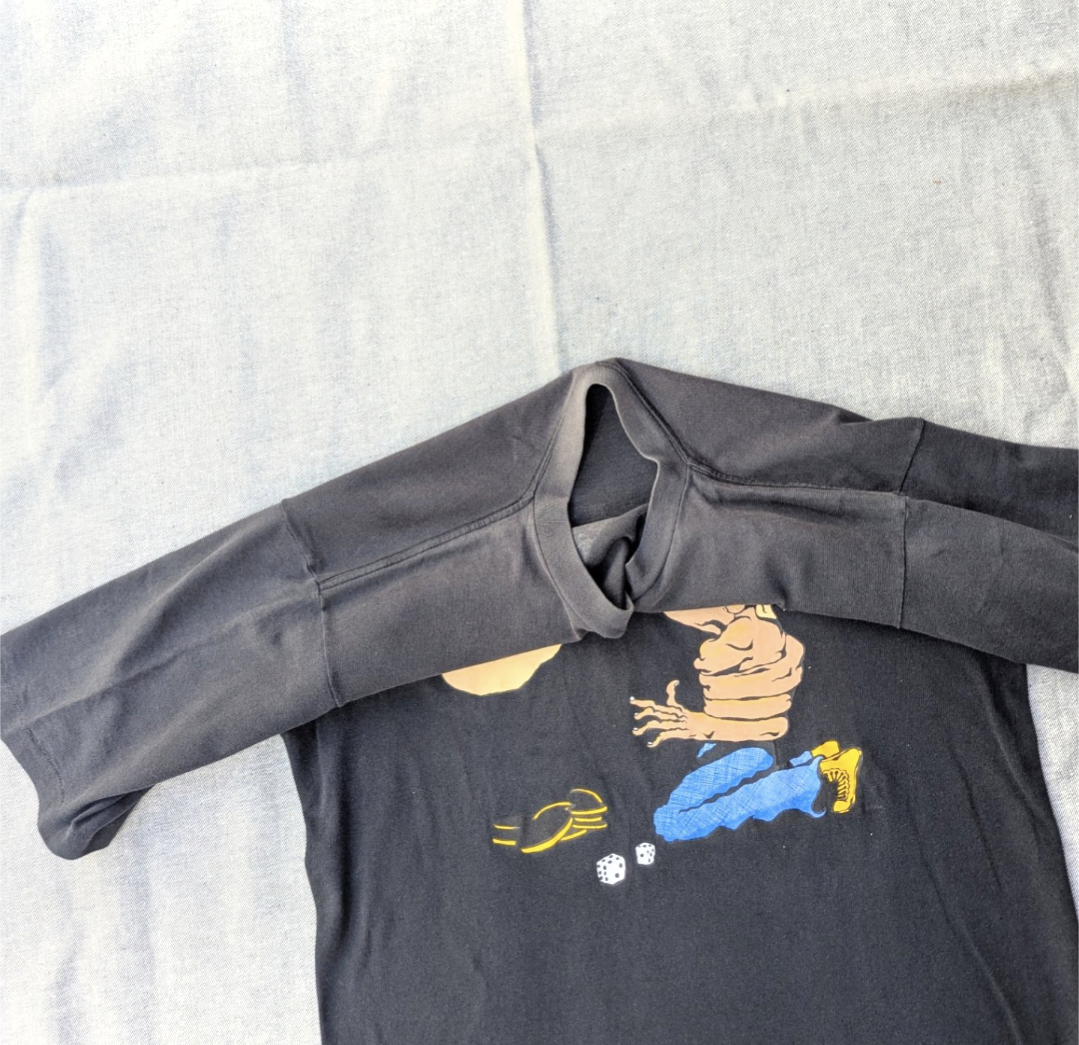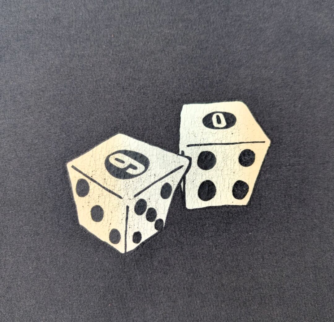 状態詳細:使用感、褪色、薄汚れ、プリント割れ、ピンホール。タグ欠損。