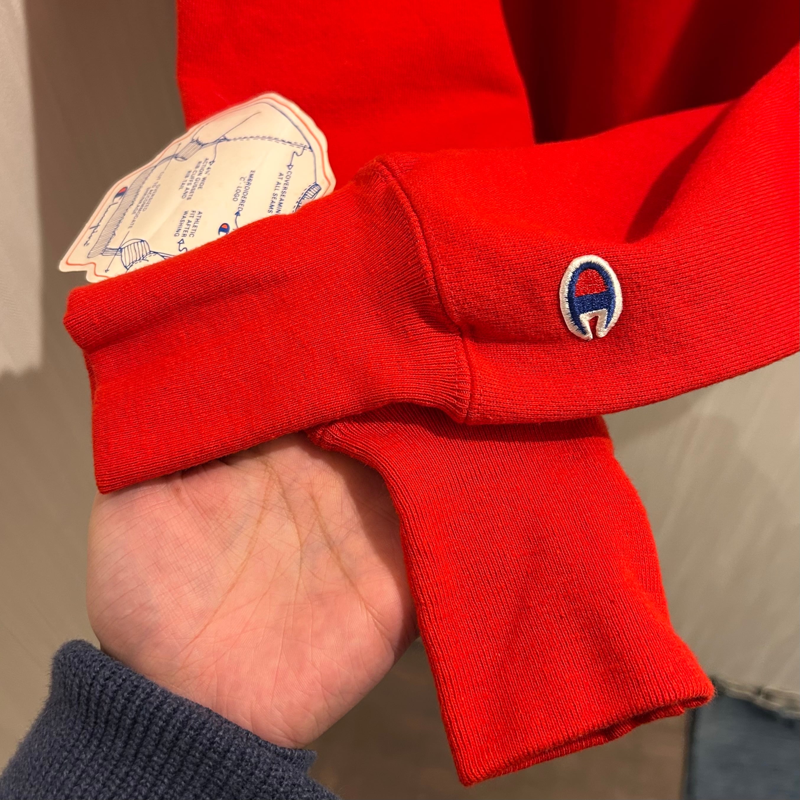 Usedの90sのリバースウィーブといえばガチガチした素材感で、身幅方向に縮んでいる個体が多い印象かと思います。