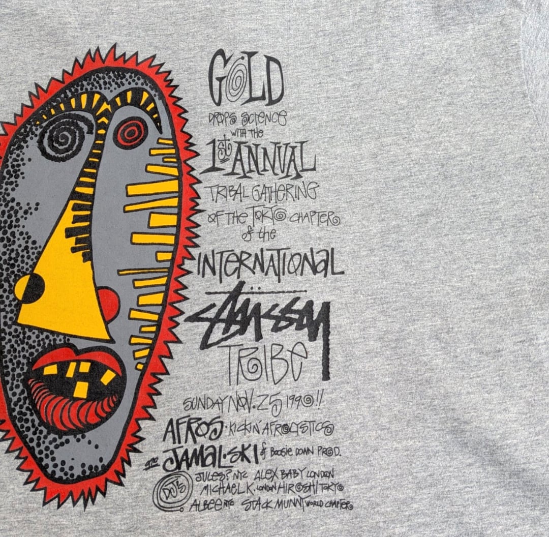 stussy bootleg " 芝浦 Gold 1st Anniversary zulu mask " print tee 小岩店