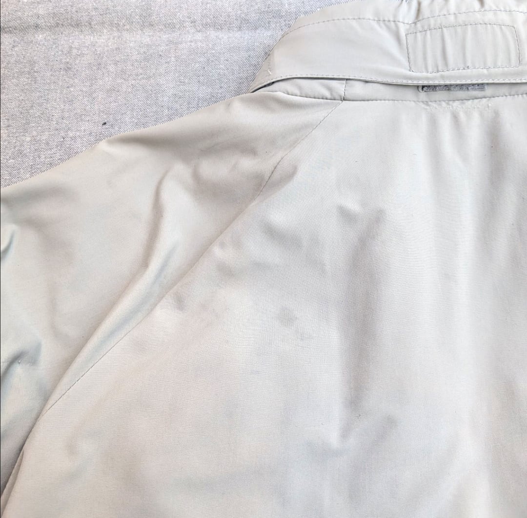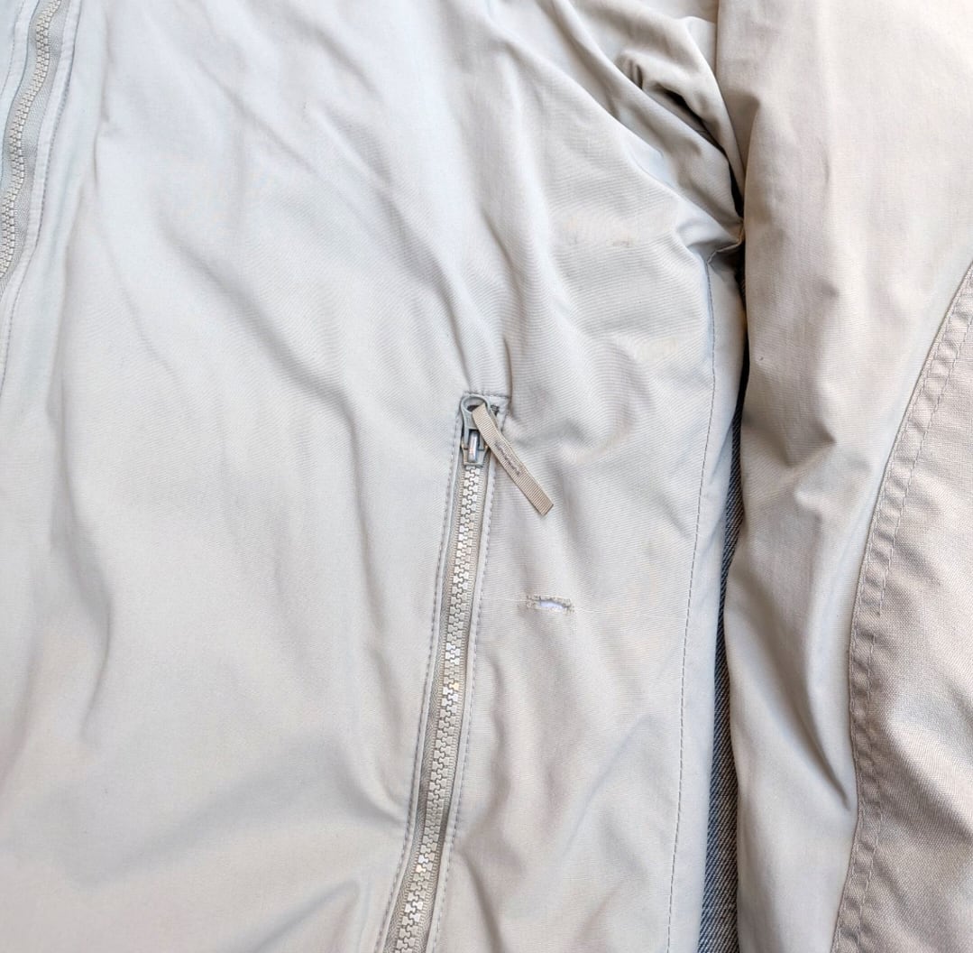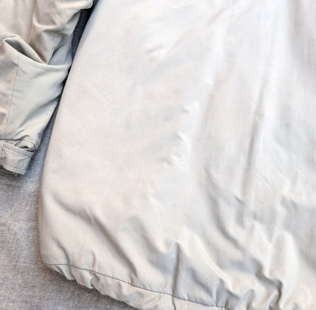 状態詳細: 使用感、擦れ、染み、汚れ、傷、ダメージ、破け、袖口リペア、テープの抜け。
