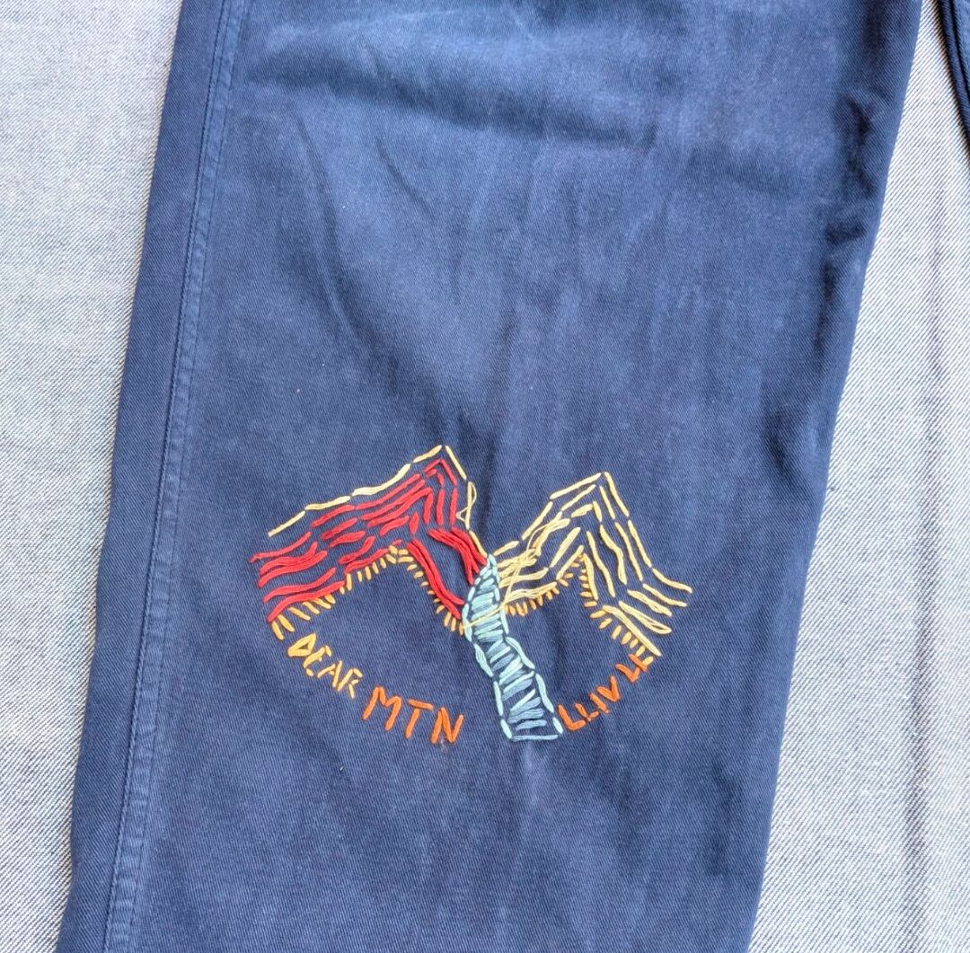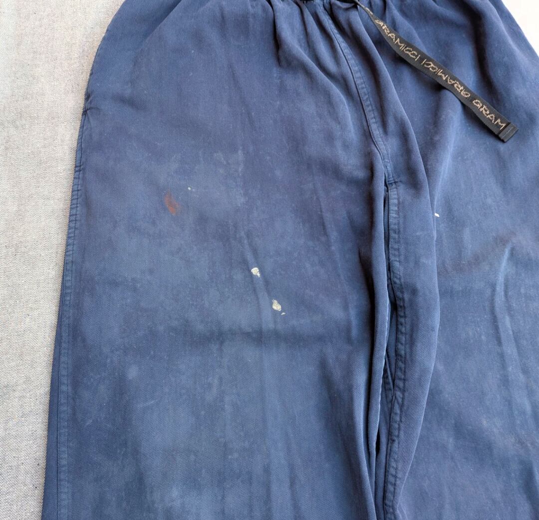 状態詳細:使用感、褪色、汚れ、擦れ、ペンキ飛び、ダメージ、小穴、ゴム伸び、カスタムで裾に刺繍を施しています。