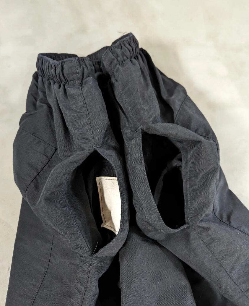 ウエストはゴムとドローコードで調整可能で、裾はゴムとジップ、左右にサイドポケット付き。