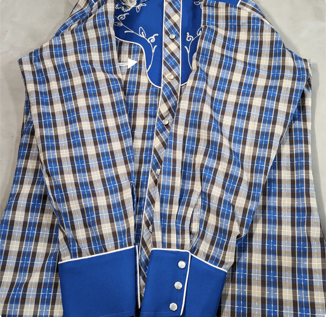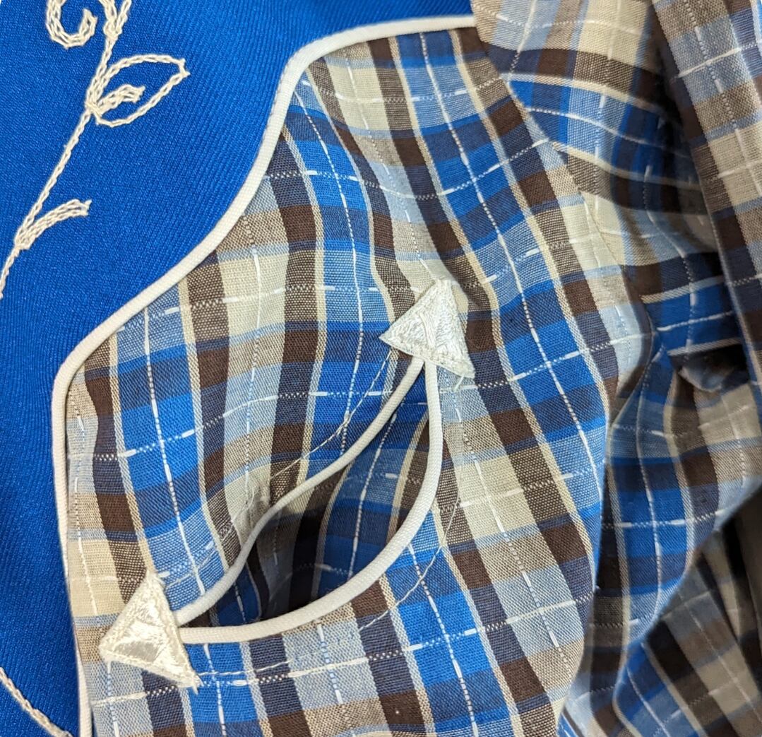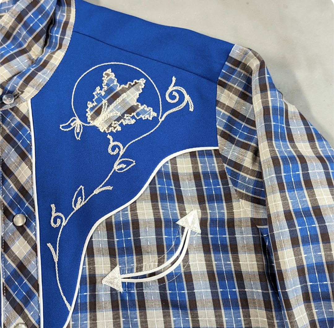 ヨークの切替え、花の刺繍、パイピング使いまで華やかで、ウエスタンカルチャーを感じる佇まい。