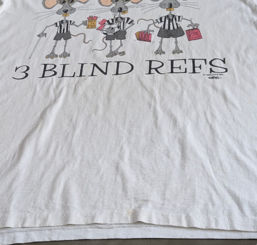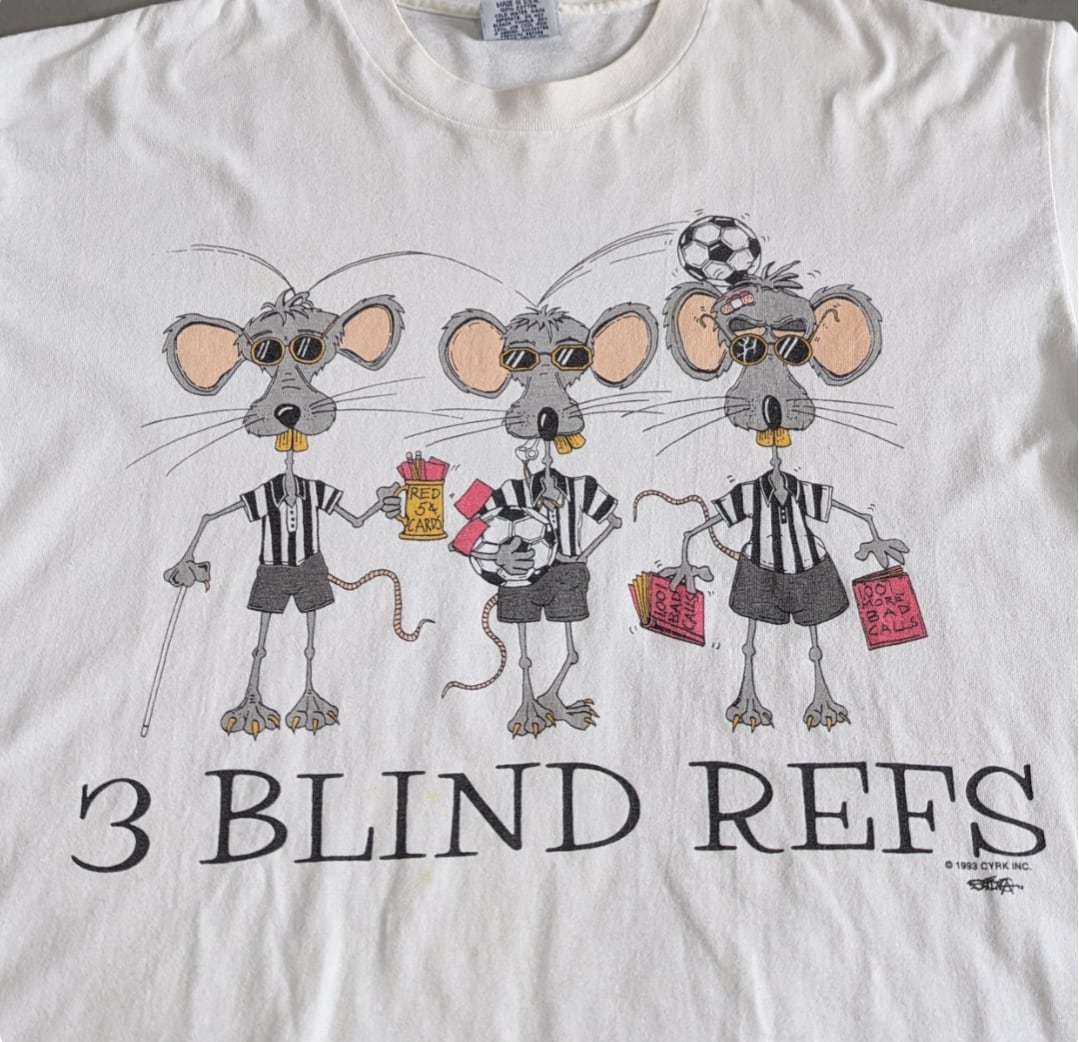 フロントに3匹の盲目のネズミのパロディである3 Blind Refsの画像があり、背面には、 「彼らがどのように走るか見て、彼らがどのように走るか見て、彼らの笛は止まっていて、彼らの目は閉じられています、彼らが何と呼ぶか、誰も知りません」と。