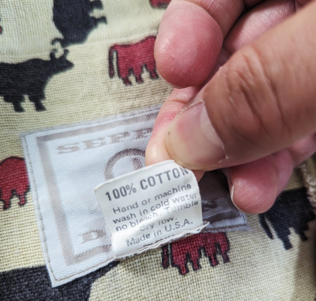 バッファロー、羊? かな 赤 黒 緑の総柄。