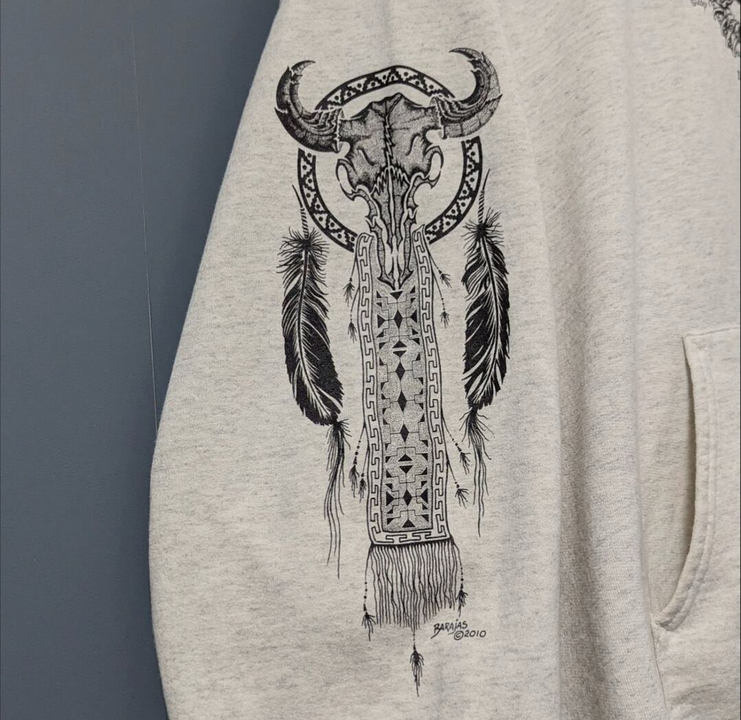 フロント、背面、腕にはネイティブなプリントが施された豪華で洒落たグラフィックのフーディです。