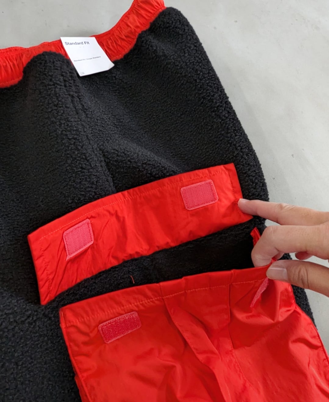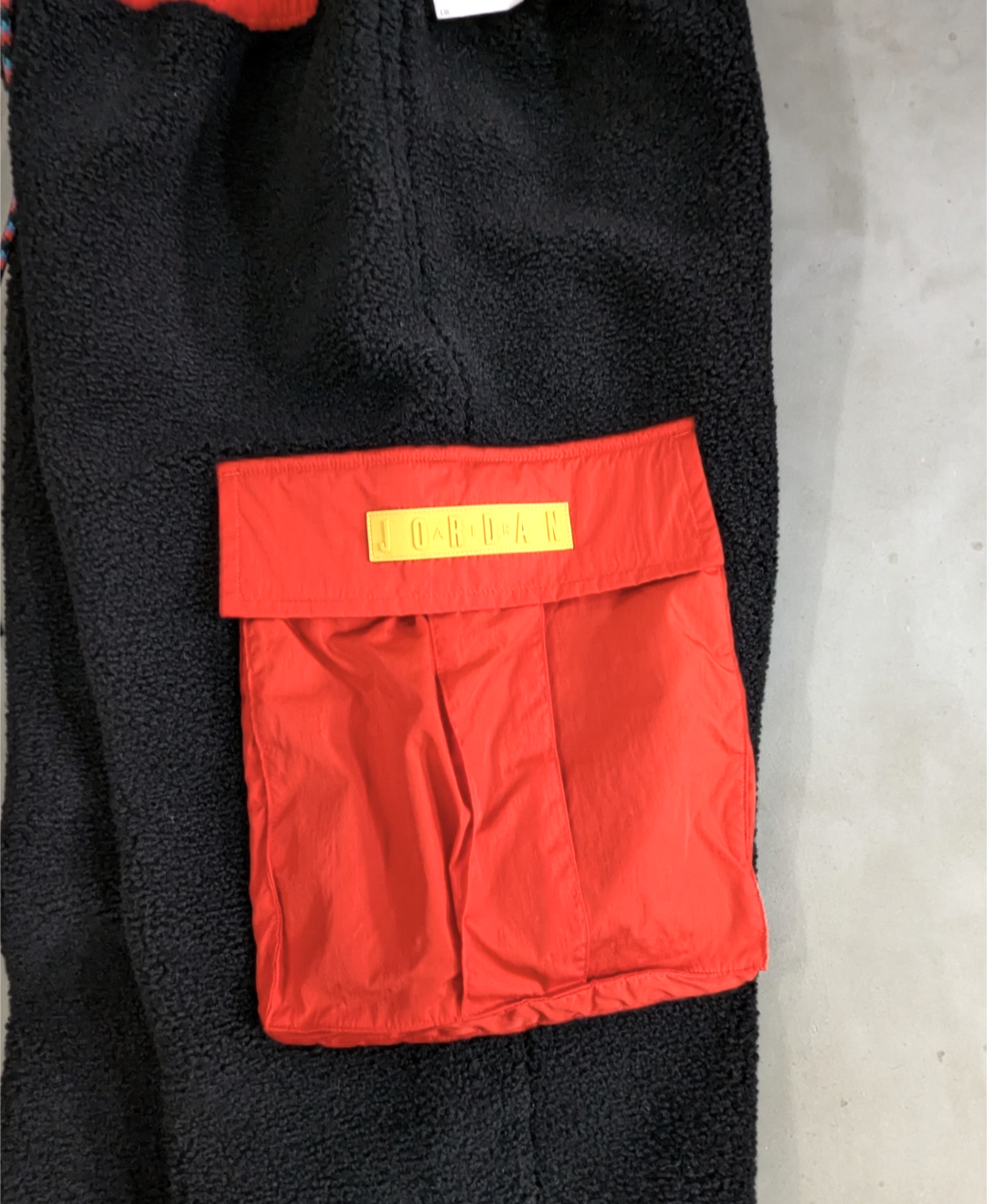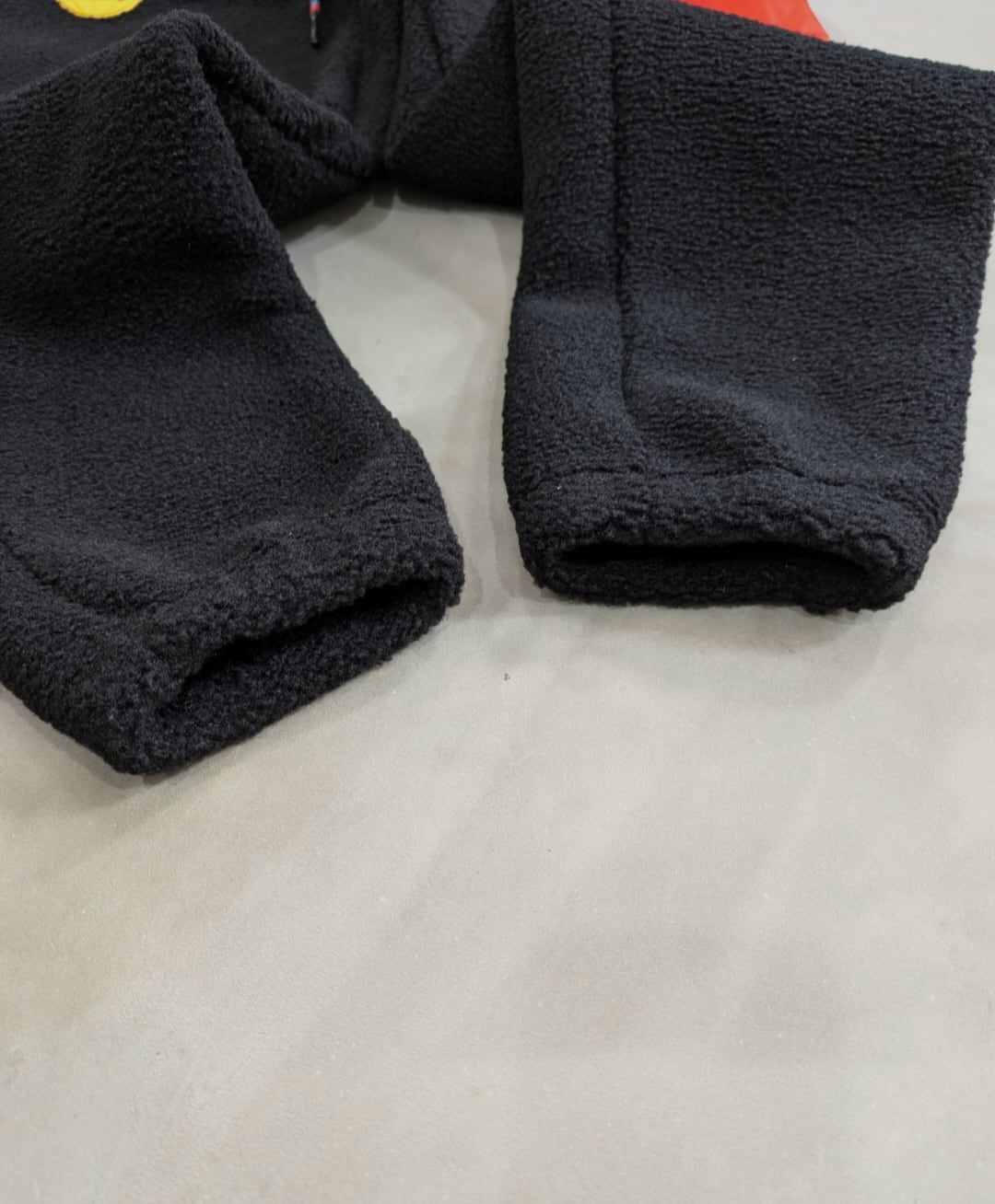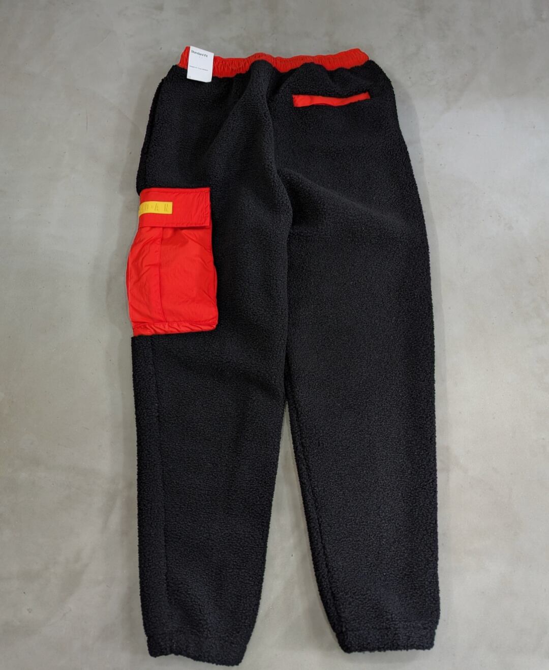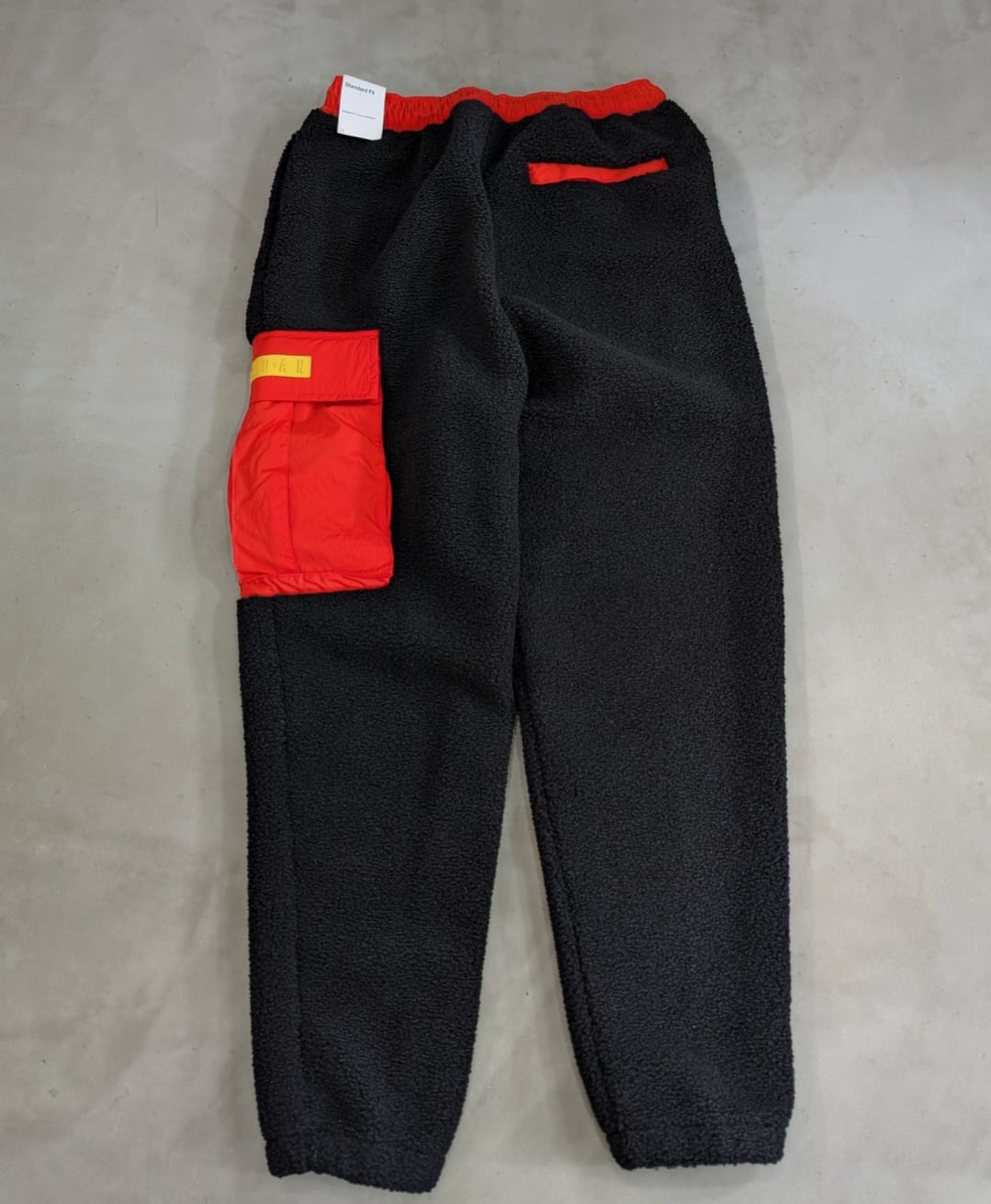 ハンドポケット付き、片面カーゴポケット、裾ゴム入り、起毛の保温性高いフリース素材です。
