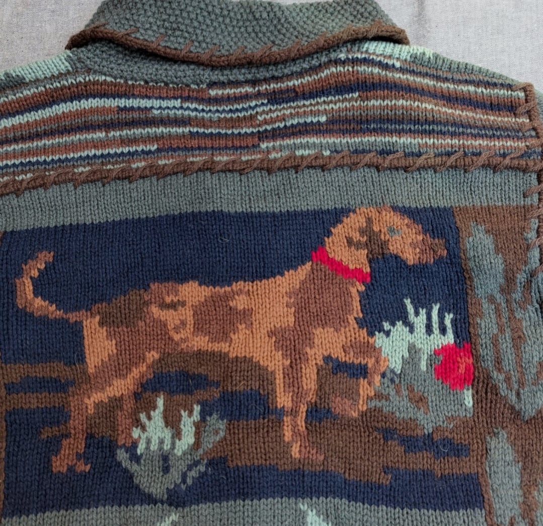 ショールカラーでステッチ、クルミボタン、トナカイ、背面と袖に犬と〇ルフローレンを彷彿させる
