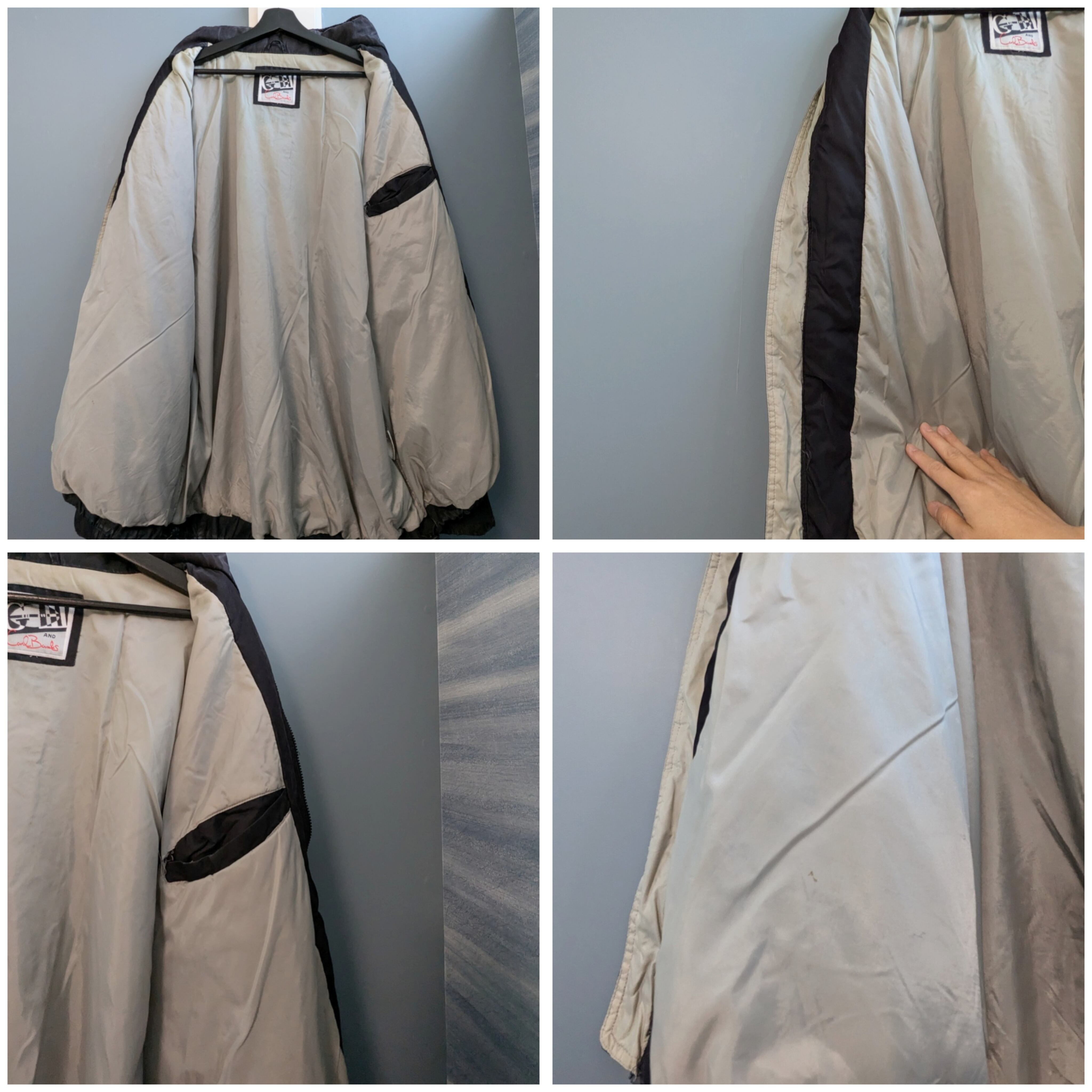 状態詳細:使用感、擦れ、全体的に褪色(特に袖、ポケットから下半身、ネック周り写真を参照に)、小穴のヤケ2箇所、内側のナイロン面に小傷。