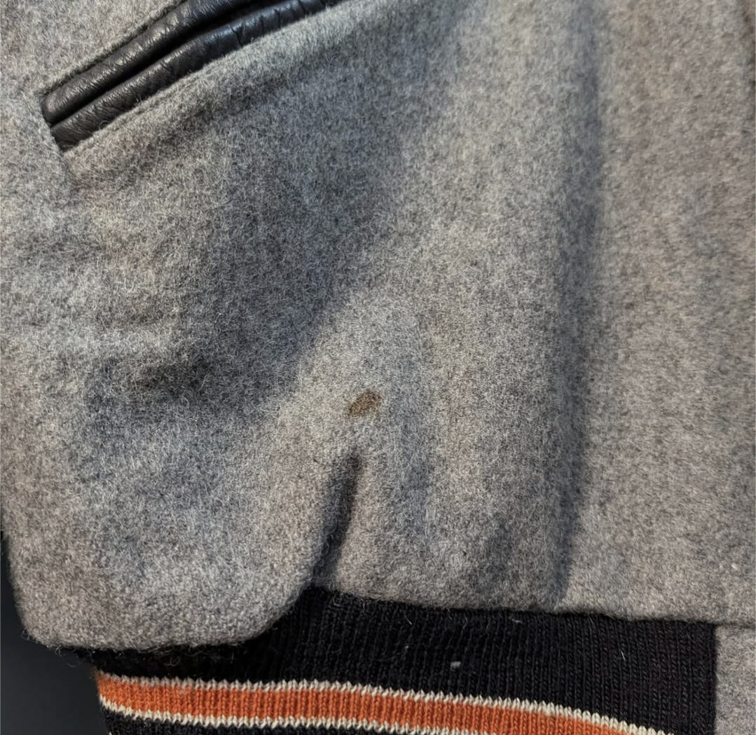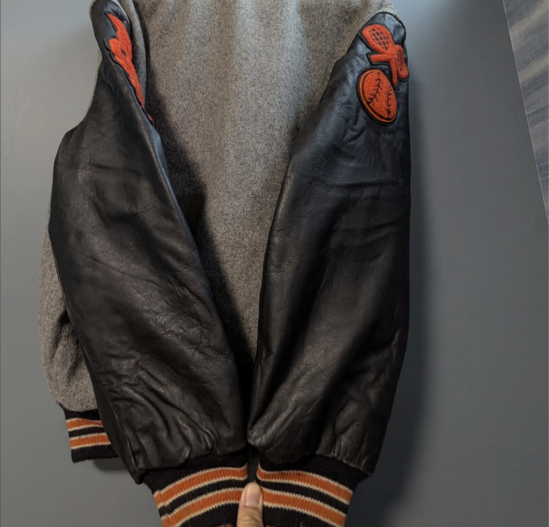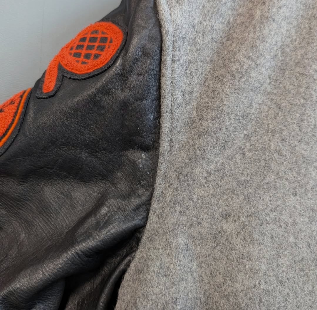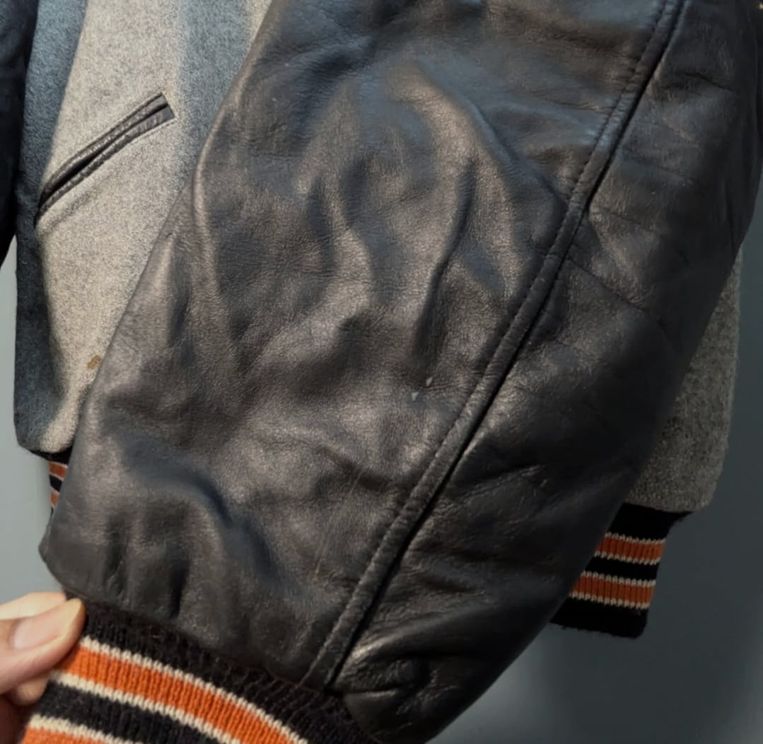 グレー×袖レザーのブラックボディにオレンジのレタリング◎