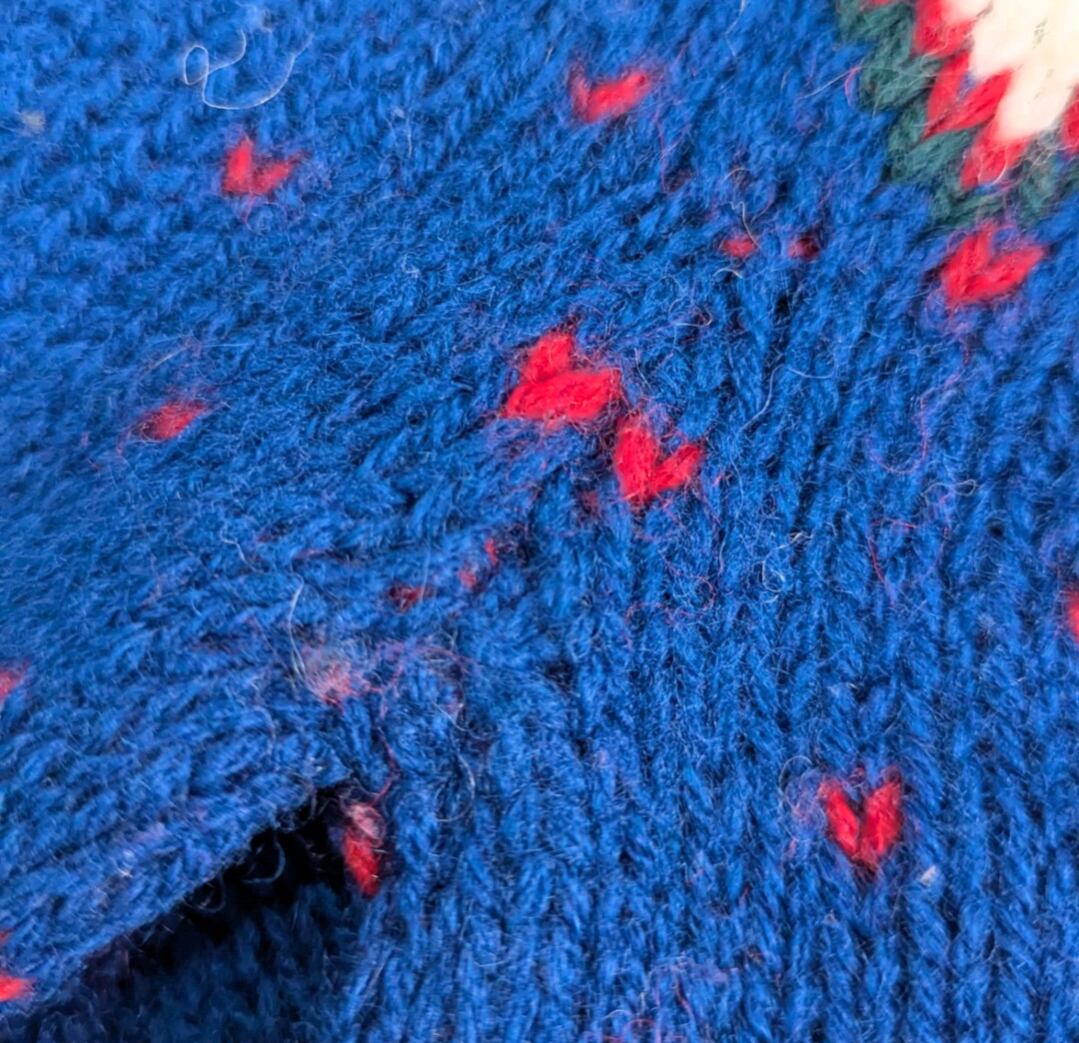 状態詳細:使用感、毛玉、薄汚れ、脇の気にならない程度のホツレ、箇所により編み穴あり。